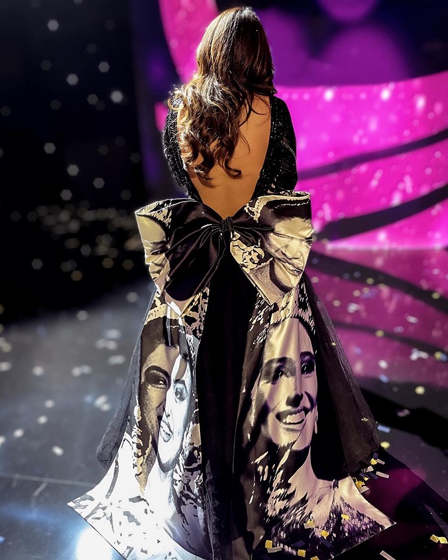 हरनाज संधू ने सुष्मिता और लारा की प्रिंट की हुई ड्रेस भी पहन रखी है
