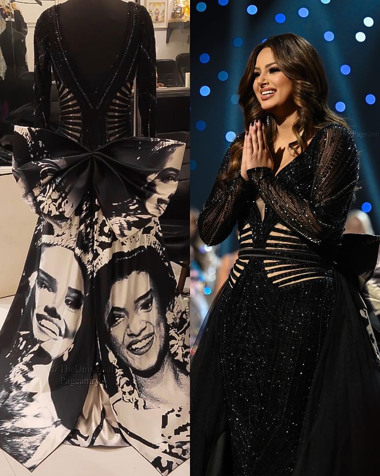 पूर्व मिस यूनिवर्स हरनाज संधू की ड्रेस पर बेहद खास तस्वीर छपी हुई थी। इस बड़े मंच पर हरनाज ने सुष्मिता सेन और लारा दत्ता को ट्रिब्यूट दिया। जो उनसे पहले भारत का नाम दुनियाभर में रोशन कर चुकी हैं। हरनाज की ड्रेस के बैक साइड पर मिस यूनिवर्स 1994 सुष्मिता सेन और मिस यूनिवर्स 2000 लारा दत्ता की फोटो बनीं हुई थी।बता दें, मिस यूनिवर्स का खिताब तीन बार भारत ने अपने नाम किया है।