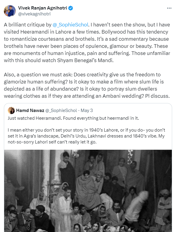 कई लोगों को तो ये भी नहीं समझ आया कि संजय लीला भंसाली तवायफों की जिंदगी के किस पहलू को दिखाना चाहते हैं। अब हाल ही में कई सोशल मीडिया यूजर्स के बाद विवेक अग्निहोत्री ने भी संजय लीला भंसाली को 'हीरामंडी' को लेकर पाकिस्तानी यूजर को सपोर्ट किया है।