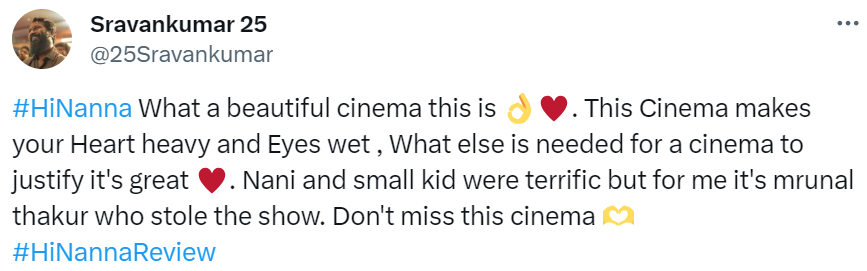 एक यूजर ने सोशल मीडिया हैंडल एक्स पर फिल्म की तारीफ करते हुए लिखा 'HiNanna यह कितना खूबसूरत सिनेमा है। यह सिनेमा आपके दिल को भारी और आंखों को नम कर देता है, एक सिनेमा को बेहतरीन साबित करने के लिए और क्या चाहिए। नानी और छोटा बच्चा बहुत अच्छे थे, लेकिन मेरे लिए यह मृणाल ठाकुर हैं जिन्होंने शो चुरा लिया। इस सिनेमा को न चूकें'।