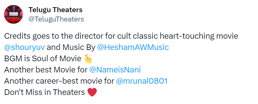 एक अन्य यूजर ने लिखा 'दिल को छू लेने वाली क्लासिक फिल्म और संगीत के लिए निर्देशक को श्रेय जाता है। बीजीएम मूवी की आत्मा है। नानी के लिए एक और बेहतरीन फिल्म, मृणाल ठाकुर के करियर की एक और सर्वश्रेष्ठ फिल्म, थियेटरों में देखने से मत चूकिए'।
