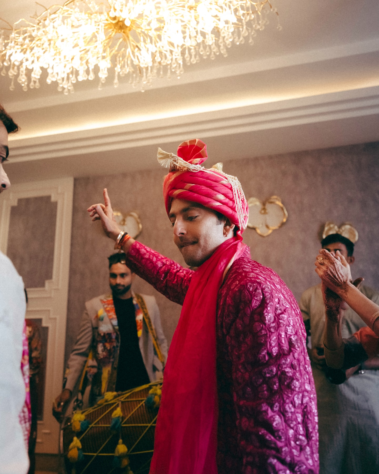 हिमांश इन फोटोज में डार्क पिंक शेड की शेरवानी में नजर आ रहे हैं। इसी के साथ उन्होंने मैचिंग की पिंक कलर की पगड़ी भी पहनी हुई है। शादी की इन फोटोज में एक्टर अपनी पत्नी के माथे को किस कर उनपर प्यार बरसाते दिखे। वहीं हिमांश कोहली की दुल्हन ने गोल्डन और रेड कलर के लहंगे में काफी ज्यादा खूबसूरत लग रही हैं। उन्होंने अपना लुक माथा पट्टी, गोल्ड नेकलेस और मैचिंग चूडियां पहनकर पूरा किया है।