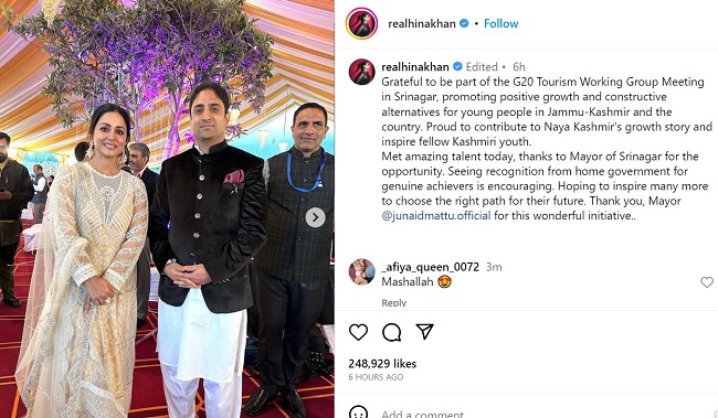 हिना खान ने इंस्टाग्राम पर भी G20 कार्यक्रम में भाग लेने की जानकारी दी है। उन्होंने लिखा है,