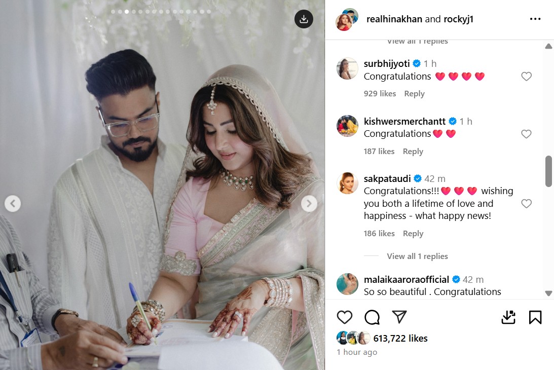 उन्होंने आगे लिखा,"आज हमारा मिलन हमेशा के लिए प्यार और कानून में सील हो गया है। हम पत्नी और पति के रूप में आपका आशीर्वाद और शुभकामनाएं चाहते हैं।" हिना और रॉकी ने मनीष मल्होत्रा के डिजाइन किए गए आउटफिट पहने थे।