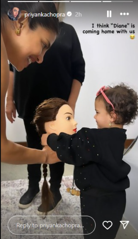 आखिरी फोटो में प्रियंका और मालती हाथ में एक डमी पकड़े हुए नजर आ रही हैं। मालती उस डमी की चोटियां देखकर काफी खुश नजर आ रही हैं। इस फोटो पर मालती ने कैप्शन लिखा- 'मुझे लग रहा है Diane हमारे साथ घर आ रही है।'