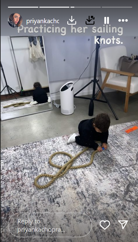तीसरी फोटो में मालती को प्रियंका के मेकअप रूम में एक लंबी रस्सी के साथ खेलते हुए देखा जा सकता है। इस फोटो पर प्रियंका ने कैप्शन लिखा, 'अपनी सेलिंग नॉट्स की प्रैक्टिस करते हुए।'