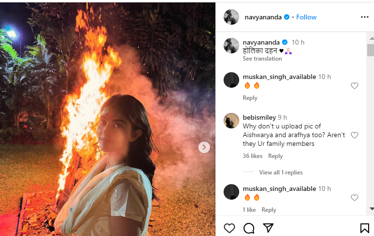 अमिताभ बच्चन के घर हुए इस होलिका दहन में नव्या नंदा ने ऐश्वर्या राय और आराध्या के साथ तस्वीरें नहीं शेयर की, जो सोशल मीडिया पर कुछ लोगों को पसंद नहीं आया। ये नाराजगी उनके कमेंट सेक्शन में देखने को मिली। नव्या के पोस्ट पर कमेंट करते हुए एक यूजर ने कहा, "आप ऐश्वर्या और आराध्या के साथ भी फोटो शेयर क्यों नहीं करती? क्या वो आपके परिवार का हिस्सा नहीं हैं।" एक अन्य यूजर ने कहा, "मुझे बुरा लगता है। ऐश्वर्या आपको लोगों के साथ कभी फोटो नहीं लेतीं।"