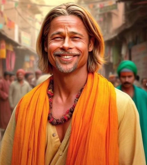 गले में रुद्राक्ष की माला और भगवा रंग का गमछा पहने मुस्कुरा रहे ब्रैड पिट को देख लग रहा है, जैसे वह किसी गली मोहल्ले में इस भेष में खड़े हैं। बैकग्राउंड देखकर लग रहा है, जैसे वह बनारस की गलियों में हैं।