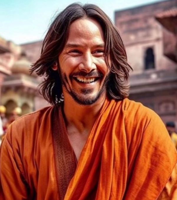 अमिताभ बच्चन स्टाइल में भगवा गमछा ओढ़े नजर आ रहे कीनू रीव्स एकदम भारतीय साधु लग रहे हैं।