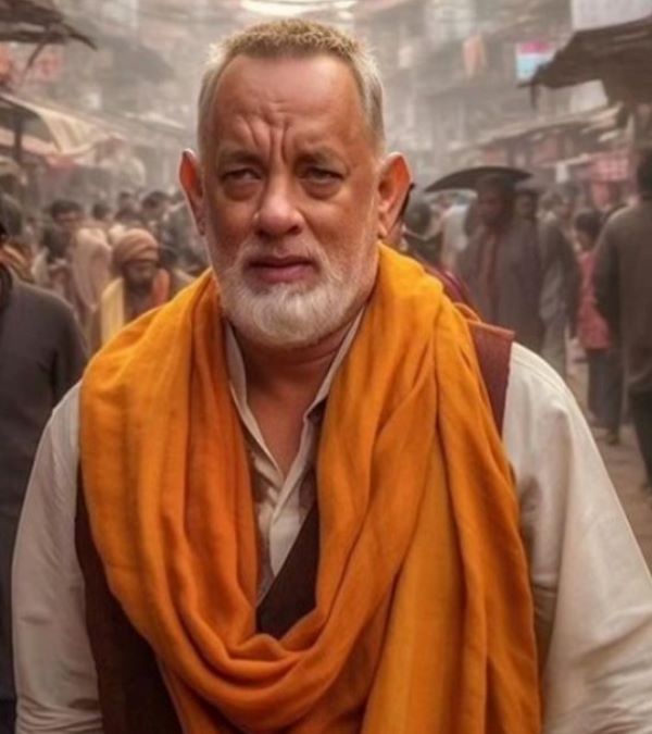 टॉम हैंक्स को साधु का लुक देने के लिए सिर्फ भगवा गमछा पहनाया गया है।