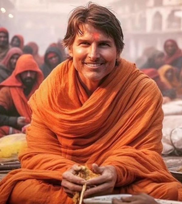 सामने देखकर मुस्कुरा रहे यह अभिनेता कोई और नहीं, बल्कि टॉम क्रूज हैं। माथे पर तिलक और हाथ जोड़ कर वह बैठे नजर आ रहे हैं।