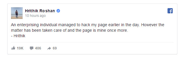 रितिक ने अपने फेसबुक अकाउंट पर पोस्ट कर बताया कि उनका अकाउंट किसी शख्स ने हैक कर लिया था। लेकिन अब मामला सुलझ गया है। अब फेसबुक पेज मेरे अधिकार में हैं।