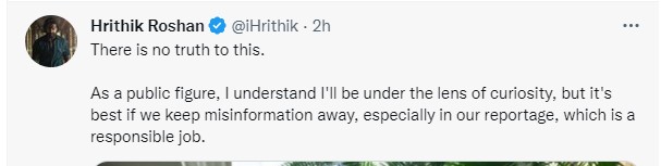 विक्रम वेधा एक्टर ऋतिक रोशन ने ट्विटर पर बताया कि उनके और सबा आजाद के नए घर में मूव इन करने की खबरें गलत हैं। उन्होंने ट्वीट किया, 'इसमें कोई सच्चाई नहीं है। एक पब्लिक फिगर के तौर पर मुझे पता है कि मैं लोगों की नजरों में बना रहूंगा, लेकिन यह अच्छा होगा अगर हम गलत जानकारी को दूर रखें, खासकर रिपोर्टिंग में, जो कि एक रिस्पांसिबल जॉब है।'