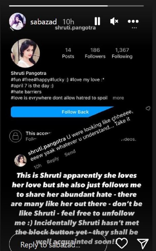 सबा आजाद ने स्क्रीनशॉट शेयर करते हुए शनिवार को उस कमेंट के लिए यूजर को लताड़ लगाई है। ट्रोलर ने लिखा है, 'आप यक लग रहे हो, आप जो भी समझते हो, इसे ले लीजिए।' अब सबा ने स्क्रीनशॉट शेयर करते हुए लिखा है, 'यह श्रुति है। वह अपने आपको प्यार करती है लेकिन वह मुझसे नफरत करती है। आप श्रुति की तरह मत बनिए। आप मुझे अनफॉलो कर सकते हैं। शायद श्रुति ने अभी तक इस बटन का उपयोग नहीं किया है। उनको करना चाहिए।'