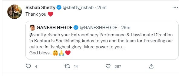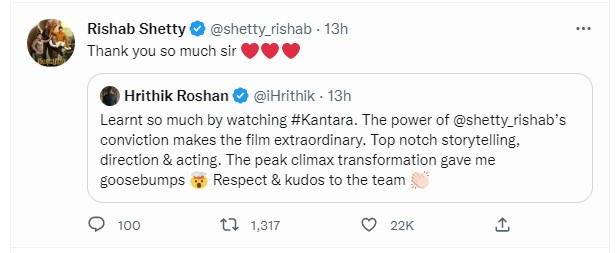 'विक्रम वेधा' स्टार ऋतिक रोशन ने 'कांतारा' के निर्देशक और अभिनेता ऋषभ शेट्टी की खूब तारीफ की। उन्होंने ट्वीट किया जिसमें लिखा, 'कांतारा' देखकर काफी कुछ सीखने को मिला। ऋषभ शेट्टी के कनविक्शन की पावर ने फिल्म को असाधारण बना दिया। बेहतरीन स्टोरी टेलिंग, डायरेक्शन और एक्टिंग। पीक क्लाइमेक्स ट्रांसफॉरमेशन ने मेरे रोंगटे खड़े कर दिए। टीम को मेरा सम्मान और सलाम।' इसके जवाब में ऋषभ शेट्टी ने उन्हें थैंक्यू कहा।