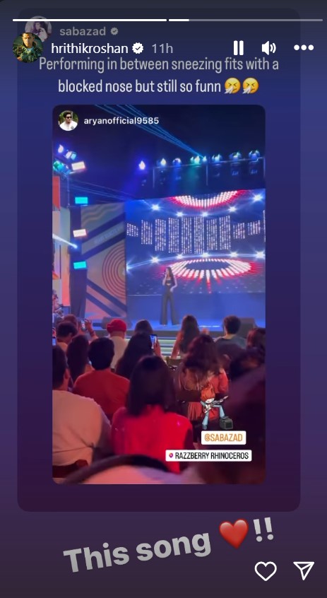 ऋतिक ने सबा आजाद के डांस वीडियो को अपनी इंस्टाग्राम स्टोरी पर रीशेयर किया। उन्होंने कैप्शन में 'ये गाना' लिखने के साथ ही रेड हार्ट इमोजी का साइन दिया। 'विक्रम वेधा' एक्टर को सबा आजाद का ये अंदाज और गाना काफी पसंद आया।