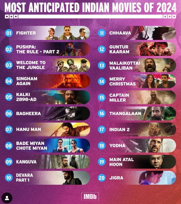 IMDb Most Anticipated Indian Films of 2024 कई बड़ी फिल्में जिनका दर्शक लंबे वक्त से इंतजार कर रहे हैं रिलीज होने वाली है। वहीं अब IMDb ने 2023 की बहुप्रतीक्षित फिल्मों की एक लिस्ट जारी की है जो हैरान करने वाली है। साल 2024 में पुष्पा 2 वेलकम 3 और काल्की समेत कई बड़ी फिल्में रिलीज होंगी। हालांकि दर्शकों को जिस फिल्म का इंतजार उसका नाम चौंकाने वाला है।