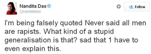 नंदिता इस वजह से काफी आहत हैं। उन्होंने ट्विटर पर इस पर सफाई दी है। नंदिता ने कहा है कि उन्हें गलत तरीके से पेश किया गया है। जबकि उन्होंने कभी कहा ही नहीं कि सभी पुरुष बलात्कारी हैं।
