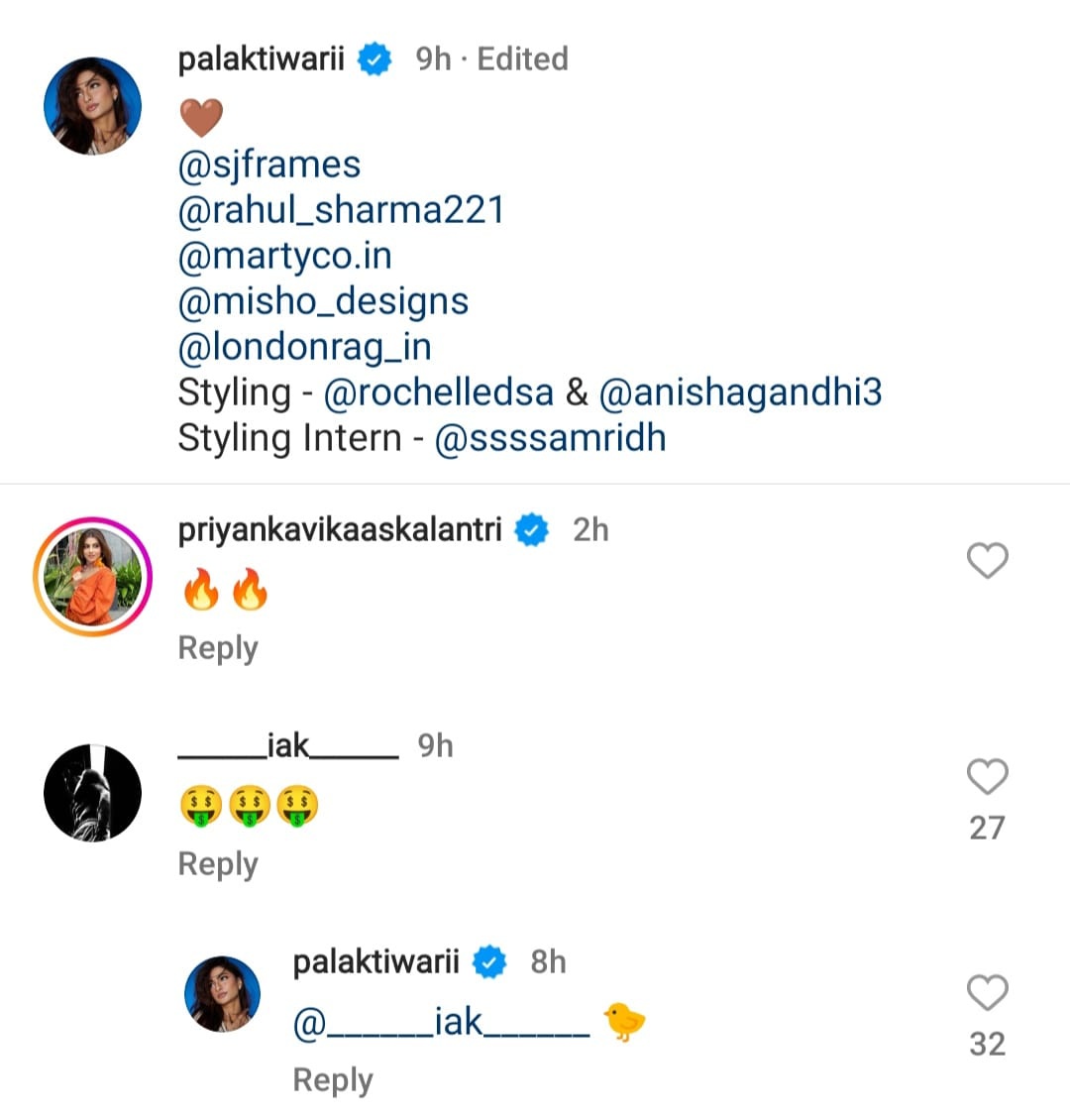 पलक की तस्वीरों का सोशल मीडिया यूजर्स ने रेड हार्ट इमोजी के साथ स्वागत किया। इन फोटो पर सैफ के लाडले इब्राहिम ने भी रिएक्शन दिया। उन्होंने तीन मनी-माउथ फेस इमोजी शेयर किए हैं। इसके जवाब में पलक ने भी यलो कलर की डक भेजी। तस्वीरों पर आ रहे इतने सारे कमेंट्स के बीच, इब्राहिम का ये रिएक्शन सुर्खियां बटोर रहा है।