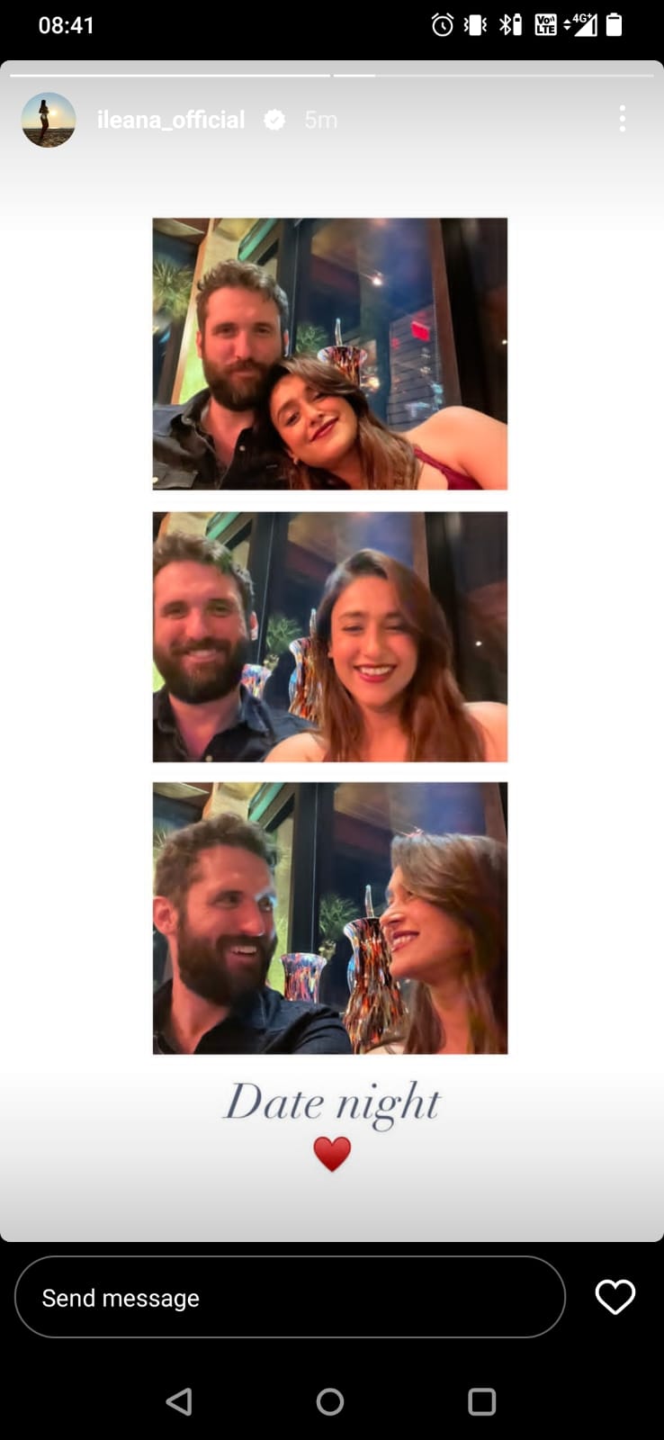 शेयर की गई इस फोटो में इलियाना अपने ब्वॉयफ्रेंड के साथ डेट नाइट एन्जॉय करती नजर आ रही है। ये तस्वीर उन्होंने इंस्टाग्राम स्टोरी पर साझा की है। इस तस्वीर के कैप्शन में उन्होंने लिखा, 'डेट नाइट'। हालांकि एक्ट्रेस ने नाम का खुलासा नहीं किया है।