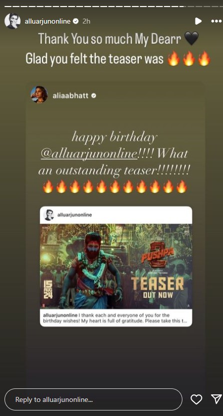 आलिया भट्ट की तारीफ सुन अल्लू अर्जुन भी शांत नहीं रह पाए और एक्ट्रेस को जवाब दिया। उन्होंने आलिया भट्ट के पोस्ट को शेयर करते हुए कहा, "आपका बहुत- बहुत शुक्रिया। खुशी हुई कि आपको टीजर फायर लगा।" इसके साथ अल्लू अर्जुन ने ब्लैक हार्ट इमोजी भी बनाई।