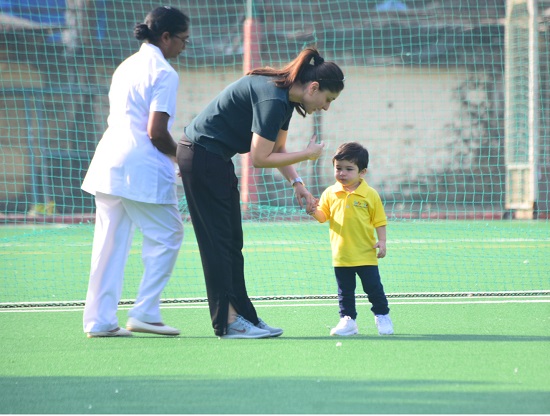 ग्राउंड पर आने के बाद करीना बेटे तैमूर को गेम के बारे में गाइड करती हैं।