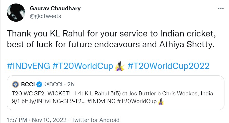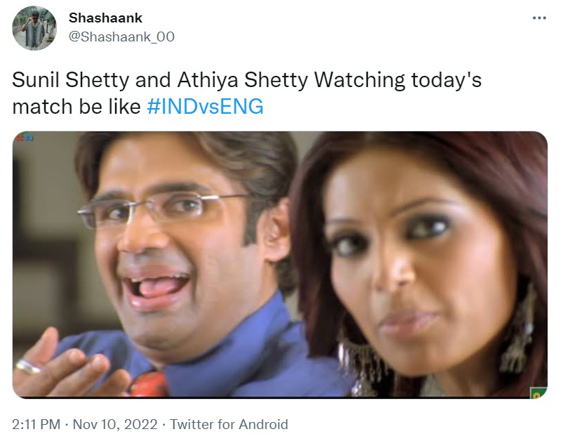 केएल राहुल के आउट होने पर एक यूजर ने सुनील शेट्टी और अथिया शेट्टी का रिएक्शन भी शेयर किया।