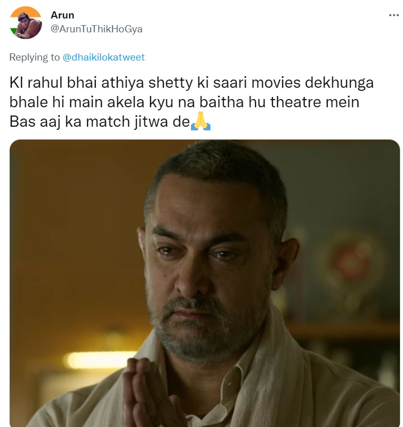 भारत-इंग्लैंड के इस टी 20 सेमी फाइनल मैच में फैंस की उम्मीदों के बीच मैदान पर उतरे केएल राहुल ने पांच गेंदें खेलीं और महज 5 रन बनाकर आउट हो गए। उन्हें क्रिस वोक्स ने विकेटकीपर जोस बटलर के हाथों कैच आउट कराया। सेमी फाइनल में केएल राहुल की ऐसी परफॉर्मेंस देख सोशल मीडिया पर लोग उन्हें और उनके साथ अथिया को जमकर ट्रोल कर रहे हैं। एक यूजर ने आमिर खान का हाथ जोड़ते हुए फोटो शेयर किया और कहा, "केएल राहुल भइया मैं अथिया शेट्टी की सारी फिल्में देखूंगा, भले ही मैं थिएटर में अकेले क्यों न बैठा हूं, बस आज का मैच जितवा दो।"