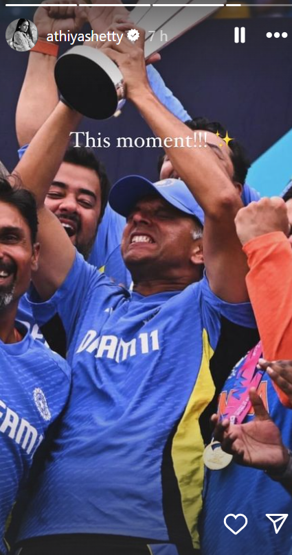 एक्ट्रेस और क्रिकेटर केएल राहुल की पत्नी अथिया शेट्टी ने भी सोशल मीडिया हैंडल इंस्टाग्राम स्टोरी पर कई फोटोज शेयर की, जिसमें टीम इंडिया ट्रॉफी उठाते हुए खुशी से झूमते हुए नजर आ रही है।