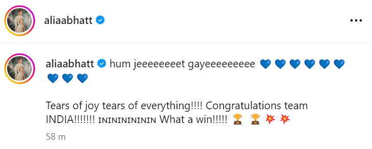 टीम इंडिया की इस ऐतिहासिक जीत के बाद आलिया भट्ट भी खुशी से झूम उठीं और उन्होंने सोशल मीडिया पर अपनी इस खुशी को जाहिर भी किया। एक्ट्रेस ने टीम की फोटो शेयर करते हुए लिखा कि हम जीत गए। खुशी के आंसू, बधाई टीम इंडिया क्या जीत है।