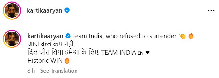 'चंदू चैम्पियन' एक्टर कार्तिक आर्यन ने भी सोशल मीडिया हैंडल इंस्टाग्राम पर टीम इंडिया का एक पोस्टर शेयर किया। इस पोस्ट को शेयर करते हुए उन्होंने लिखा कि टीम इंडिया, जिसने सरेंडर करने से किया इनकार। आज वर्ल्ड कप नहीं, दिल जीत लिया। हमेशा के लिए, टीम इंडिया। ऐतिहासिक जीत।