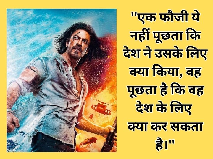 इस साल बॉक्स ऑफिस पर रिकॉर्डतोड़ कमाई करने वाली शाह रुख खान की 'पठान' भी देशभक्ति की मिसाल कायम करने वाली फिल्म रही। डायरेक्टर सिद्धार्थ आनंद की इस मूवी में शाह रुख खान का डायलॉग- ''एक फौजी ये नहीं पूछता कि देश ने उसके लिए क्या किया, वह पूछता है कि वह देश के लिए क्या कर सकता है," हर किसी को काफी पसंद आया। पठान के लास्ट सीन में जॉन अब्राहम को किंग खान ये संवाद बोलते हैं।