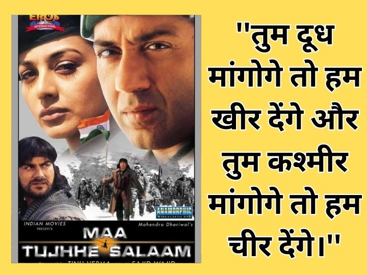 सनी देओल ने अपने फिल्मी करियर में देशभक्ति पर आधारित इंडियन, बॉर्डर, गदर जैसे कई फिल्में की हैं। उनमें से एक सुपरहिट फिल्म "मां तुझे सलाम" भी रही है। डायरेक्टर टीनू वर्मा के निर्देशन में बनी इस मूवी में यूं तो देशभक्ति बेस्ड कई सारे डायलॉग्स हैं,