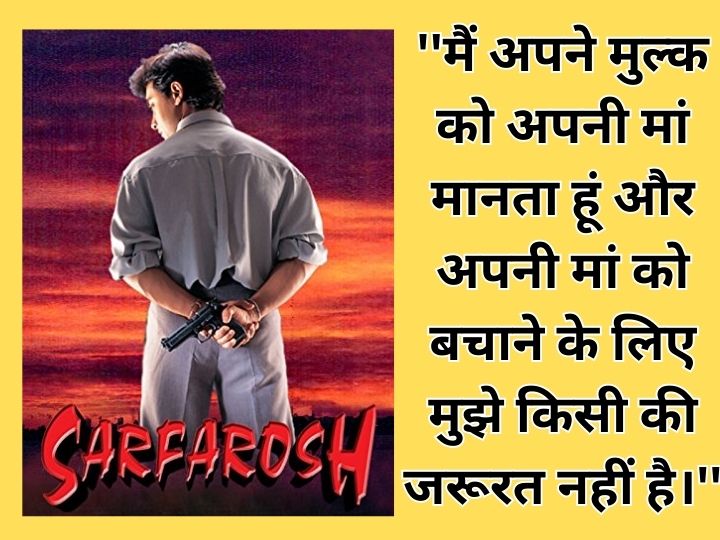 साल 1999 में आई फिल्म 'सरफरोश' में आमिर खान ने एक आईपीएस ऑफिसर का रोल प्ले किया था। इसमें आमिर के अलावा इसमें नसीरुद्दीन शाह, मुकेश ऋषि और सोनाली बेंद्रे जैसे कई कालाकार मौजूद रहे। इस मूवी में देशभक्ति पर आधारित डायलॉग- ''मैं अपने मुल्क को अपनी मां मानता हूं और अपनी मां को बचाने के लिए मुझे किसी की जरूरत नहीं है।'' एसीपी अजय सिंह राठौर के किरदार में आमिर के इस संवाद ने हर किसी का दिल जीत लिया।