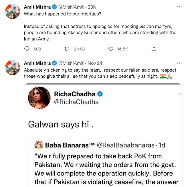 अमित मिश्रा ने ट्विटर पर गुरुवार को लिखा, 'हमारी प्राथमिकताओं को क्या हो गया है। एक एक्ट्रेस को गलवान के शहीदों का मजाक उड़ाने के लिए माफी मांगने की बजाय हम अक्षय कुमार और अन्य जो कि भारतीय सेना के साथ खड़े हैं, उन्हें ट्रोल कर रहे हैं।' इसके पहले अक्षय कुमार ने ऋचा चड्ढा का स्क्रीनशॉट शेयर करते हुए लिखा था, 'मुझे यह देखकर दुख हुआ। सेना के जवानों के प्रति हम अनग्रेसफुल नहीं हो सकते। वह है तो आज हम हैं।'
