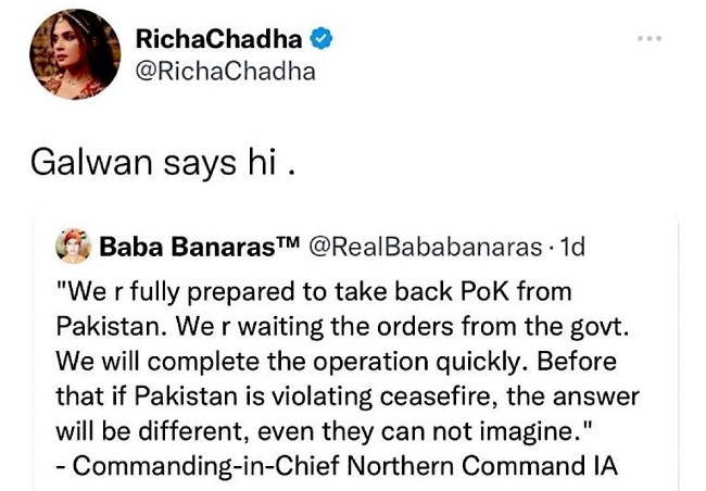 गौरतलब है कि भारतीय रक्षा मंत्री राजनाथ सिंह भी पाकिस्तान ऑक्यूपाइड कश्मीर वापस लेने के बाद कह चुके हैं। इस बीच ऋचा चड्डा ने अपने बयान पर माफी मांगी है। वहीं उन्होंने ट्वीट डिलीट भी कर दिया है लेकिन उन्हें इसे लेकर जमकर ट्रोल किया जा रहा है। स्वरा भास्कर भी ऋचा चड्ढा का समर्थन करते नजर आई। उन्हें भी जमकर लताड़ लगाई गई है।