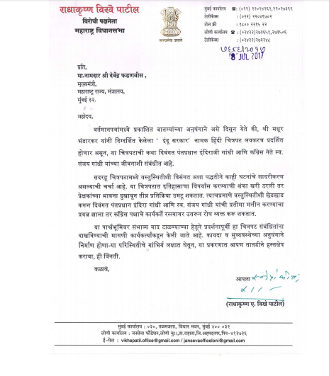 मुंबई। मधुर भंडारकर की फ़िल्म 'इंदु सरकार' का ट्रेलर जब से रिलीज़ हुआ है, तब से सियासत गर्मा गयी है। फ़िल्म की पृष्ठभूमि इमरजेंसी के दौर की है, जिसकी वजह से इसके लिए मुश्किलें खड़ी हो रही हैं। अब कांग्रेस लीडर और महाराष्ट्र विधान सभा में नेता प्रतिपक्ष राधाकृष्ण विरवे पाटिल ने इस मामले में हस्तक्षेप करने की मांग मुख्यमंत्री देवेन्द्र फड़णवीस से की है।