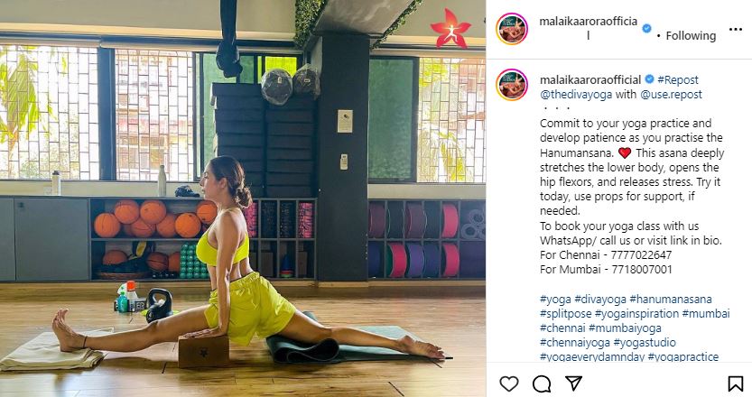 मलाइका अरोड़ा सिर्फ योग की वीडियो पोस्ट करके फैंस को इंस्पायर नहीं करतीं, बल्कि वह उससे होने वाले फायदे के बारे में भी बताती हैं। उन्होंने हनुमानासन का वीडियो शेयर करते हुए बताया कि ये आसन आपकी निकली बॉडी को अंदर तक स्ट्रेच कर लचीला बनाता है, हिप फ्लेक्सिबिलिटी को बढ़ाता है और मानसिक तनाव को कम करता है।