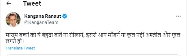 कंगना रनोट ने हाल ही में इस मामले पर अपनी प्रतिकिया जाहिर करते हुए एक ट्वीट किया है। उन्होंने लिखा, 'मासूम बच्चों को ये बेहूदा बातें न सिखाएं। इससे आप मॉर्डन या कूल नहीं, बल्कि अश्लील और फूल लगते हो'।