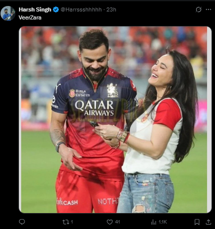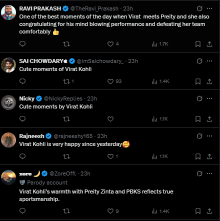 दूसरे यूजर ने लिखा, "प्रीति जिंटा और विराट कोहली जैसे मिले हैं, ये आईपीएल के सबसे अच्छे पलों में से एक है। उन्होंने विराट को जीत की बधाई भी दी"।