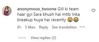 बता दें कि शुभमन गिल भी गुजरात टाइटन्स के लिए खेल रहे हैं, ऐसे में एक अन्य यूजर ने खिंचाई करते हुए लिखा, "शुभमन गिल की टीम हार गई और सारा अली खान खुश है, मतलब निश्चित रूप से दोनों का ब्रेकअप हो गया है"।