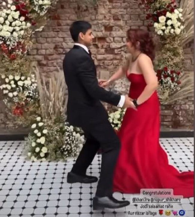 अब आइरा खान और नूपुर शिखरे की सगाई की बात की तस्वीरें और वीडियो वायरल हो रही है। आइरा खान ने इस अवसर पर ऑफ सोल्जर रेड कलर का गाउन पहन रखा था। वहीं नूपुर शिखरे ने काला सूट पहन रखा था। दोनों की सगाई का एक नया वीडियो वायरल हो रहा है। इसमें रिंग सेरेमनी के बाद दोनों को एक-दूसरे को किस करते हुए देखा जा सकता है। वहीं दोनों साथ रोमांटिक डांस करते हुए भी नजर आ रहे हैं। इस वीडियो को मुस्कान जाफरी ने इंस्टाग्राम पर शेयर किया था, जिसे आइरा खान ने दोबारा से भी शेयर किया है।