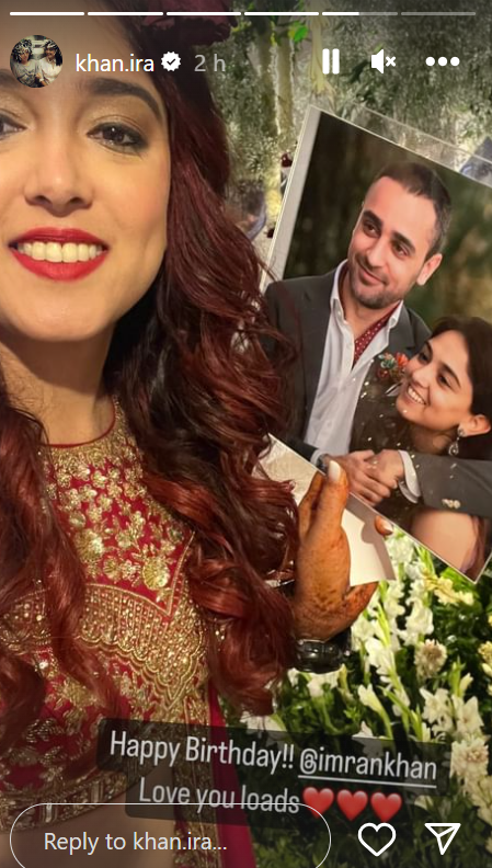 आइरा खान ने आज 14 जनवरी को अपने सोशल मीडिया हैंडल इंस्टाग्राम की स्टोरी पर अपने रिसेप्शन वाली एक तस्वीर शेयर की। इस तस्वीर में दुल्हन आइरा ने अपने हाथ में इमरान खान और अपनी एक फोटो पकड़ रखी थी। फोटो में इमरान अपना हाथ आइरा के कंधों पर रखे हुए पोज दे रहे हैं। इसके साथ ही आइरा ने कैप्शन में लिखा 'जन्मदिन मुबारक हो इमरान खान, आपको ढेर सारा प्यार'।
