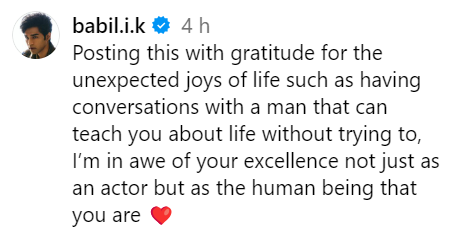इरफान खान के बेटे ने अपने सोशल मीडिया हैंडल इंस्टाग्राम पर आज रविवार को एक तस्वीर शेयर की है, जिसमें वह '3 इडियट्स' एक्टर बोमन ईरानी के साथ नजर आ रहे हैं। फोटो में दोनों स्टार्स स्माइल करते हुए कैमरा के सामने पोज देते नजर आ रहे हैं। इस फोटो को शेयर करते हुए बाबिल ने कैप्शन में लिखा कि जीवन की अप्रत्याशित खुशियों के लिए आभार के साथ यह पोस्ट कर रहा हूं।