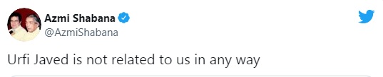 इन सारी ट्रोलिंग के बीच अब शबाना आज़मी ने ‘जावेद अख्तर की पोती’ वाली खबरों पर चुप्पी तोड़ दी है और ये साफ कर दिया है कि उर्फी का जावेद अख्तर से कोई लेना देना नहीं है। एक न्यूज़ आर्टिकल को रीट्वीट करते हुए शबाना आज़मी ने अपने ट्वीटर अकाउंट पर लिखा, ‘उर्फी जावेद हमारे साथ किसी भी तरह से संबंधित नहीं हैं’।