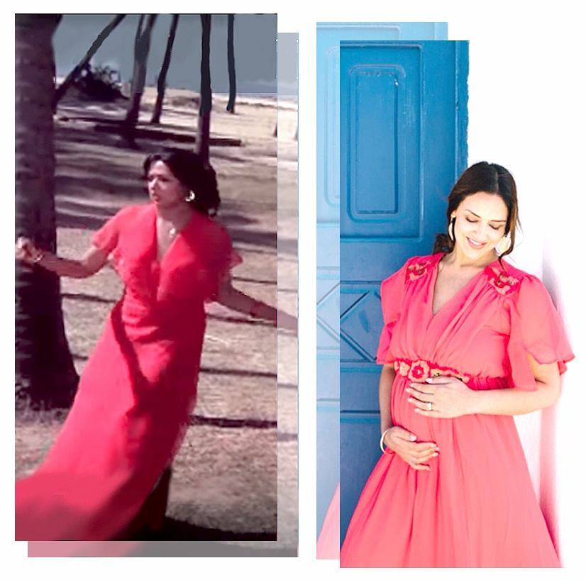 2. ईशा ने अपनी प्रेगनेंसी ड्रेस को अपनी मां के एक ख़ूबसूरत ऑउटफिट के साथ भी मैच किया। रेड लॉन्ग गाउन!