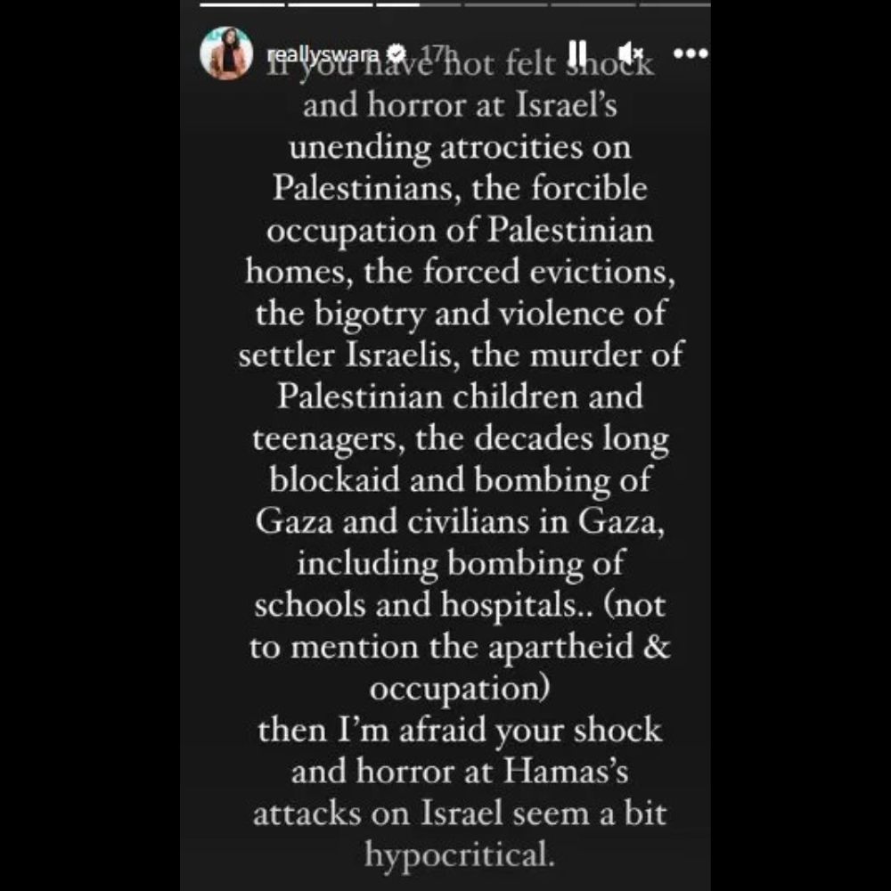 ऐसे में अब जो लोग इजरायल पर हुए अटैक का शोक मना रहें हैं तो वो दोगले हैं।'' इस तरह से स्वरा ने फिलिस्तीन के समर्थन में बड़ी बात लिखी है।