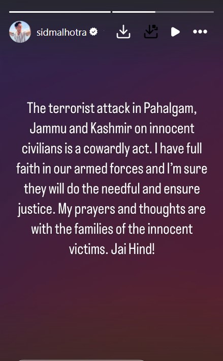 हिंसा की निंदा करने वालों में अभिनेता सिद्धार्थ मल्होत्रा भी शामिल थे। सिद्धार्थ ने अपने इंस्टा हैंडल पर आर्मी और उनके त्वरित न्याय पर अपना विश्वास व्यक्त किया। उन्होंने अपनी इंस्टाग्राम स्टोरी पर लिखा,"जम्मू-कश्मीर के पहलगाम में निर्दोष नागरिकों पर आतंकवादी हमला एक कायरतापूर्ण कृत्य है। मुझे हमारे सशस्त्र बलों पर पूरा भरोसा है और मुझे यकीन है कि वे आवश्यक कार्रवाई करेंगे और न्याय सुनिश्चित करेंगे। मेरी प्रार्थनाएं और विचार निर्दोष पीड़ितों के परिवारों के साथ हैं। जय हिंद!
