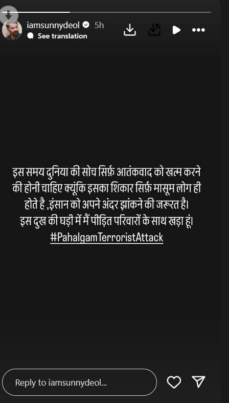 जम्मू-कश्मीर के पहलगाम (Pahalgam Terror Attack) में मंगलावर को हुए आतंकी हमले में 27 लोगों की जान चली गई। बैसरन घाटी में मंगलवार दोपहर 2.45 बजे हुए इस हमले में 20 से ज्यादा लोग घायल हैं। अब इस मामले में बॉलीवुड एक्टर सनी देओल और सिद्धार्थ मल्होत्रा ने अपनी नाराजगी जाहिर की है। एक्टर ने इंस्टा स्टोरी पर इसको लेकर पोस्ट किया है।