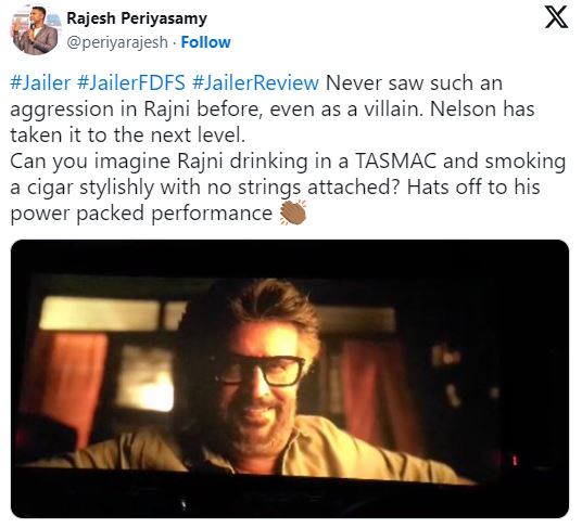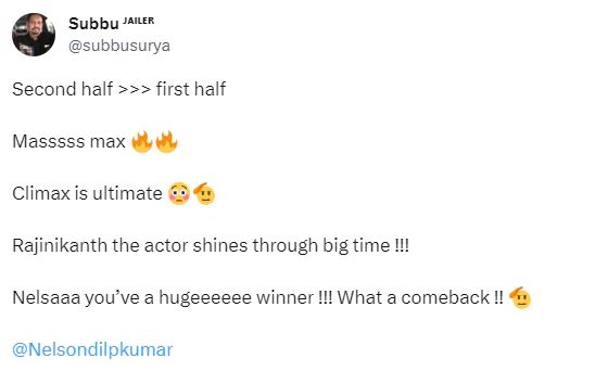 एक अन्य यूजर ने लिखा, "रजनीकांत की फिल्म का फर्स्ट हाफ बहुत ही जबरदस्त है"।